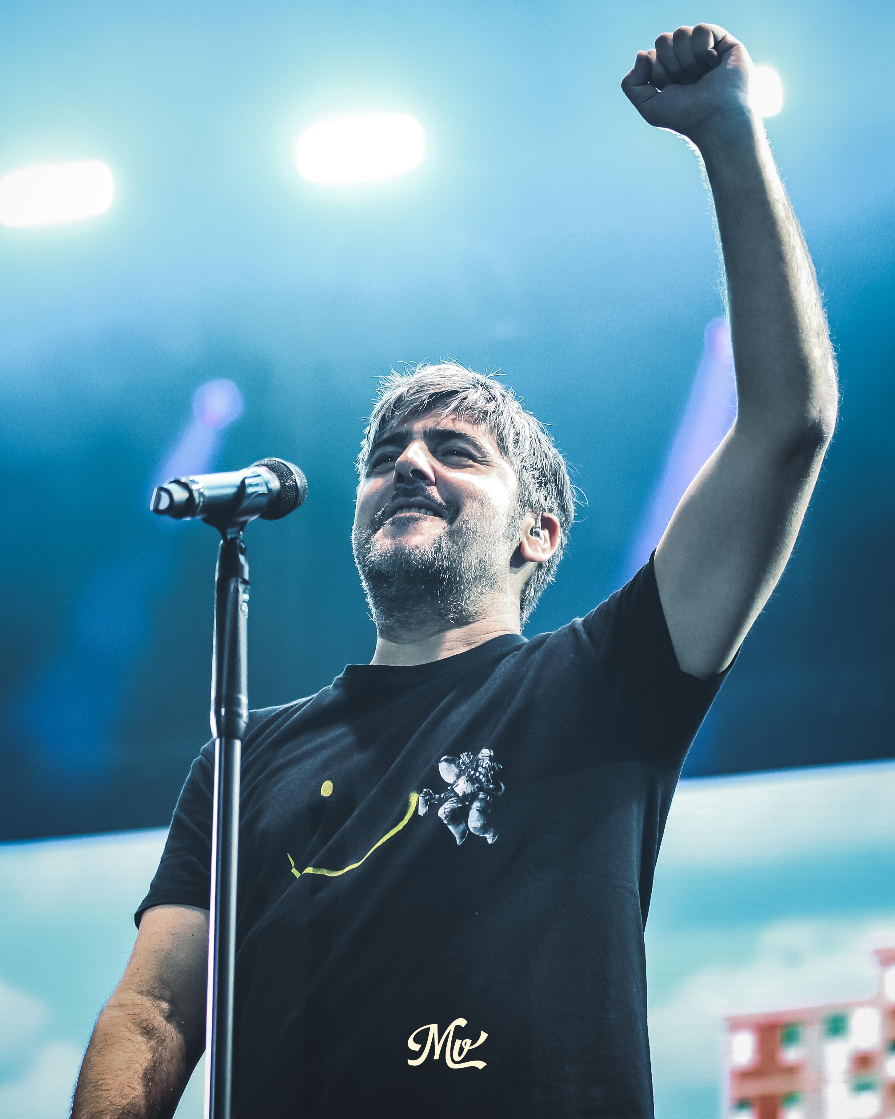 La fiesta se ha desatado nada más saltar al escenario cuando David ha comenzado a cantar ese “Fui a la orilla del río” con el que se inicia el tema “Tu calorro”, incluido en su disco de debut, que ha tenido el acompañamiento de un coro de 7.000 voces.
