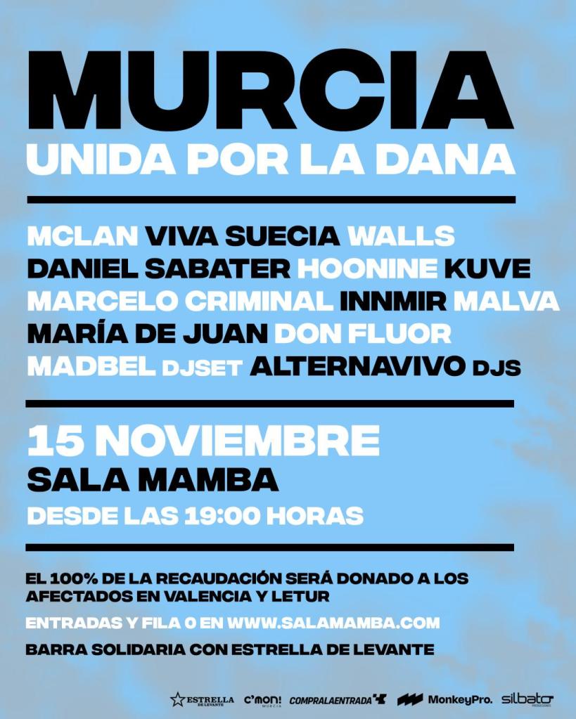 El próximo viernes 15 de noviembre la Sala Mamba de Murcia acogerá un concierto especial: “Murcia unida por la Dana”. Tiene como objetivo recaudar fondos para las personas afectadas por la DANA que ha golpeado con fuerza en la Comunidad Valenciana y Letur, dejando decenas de muertos, desaparecidos y numerosos daños materiales.