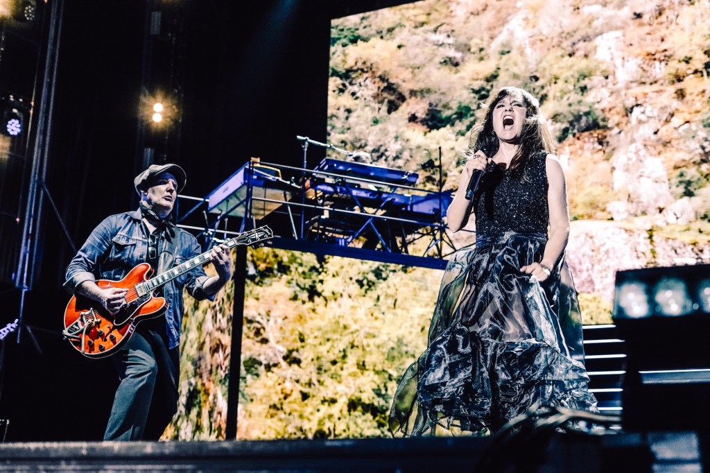 Todas estas canciones cobraron aún más fuerza gracias a una impactante puesta en escena, apoyada por efectos visuales proyectados en la gran pantalla del fondo del escenario y en otras más pequeñas integradas en los dos cubos que sostenían la batería y los teclados.